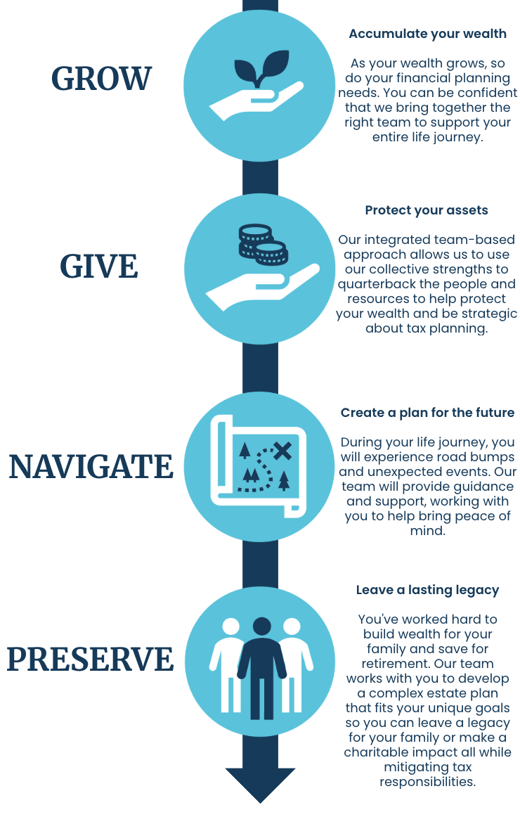 Our team, that includes individuals holding credentials such as CFP®, CPA, MBA, and JD, collaborates closely with you to develop and implement a comprehensive, personalized plan that aligns with your goals and helps you navigate The Way ForwardTM for each stage of your life.
