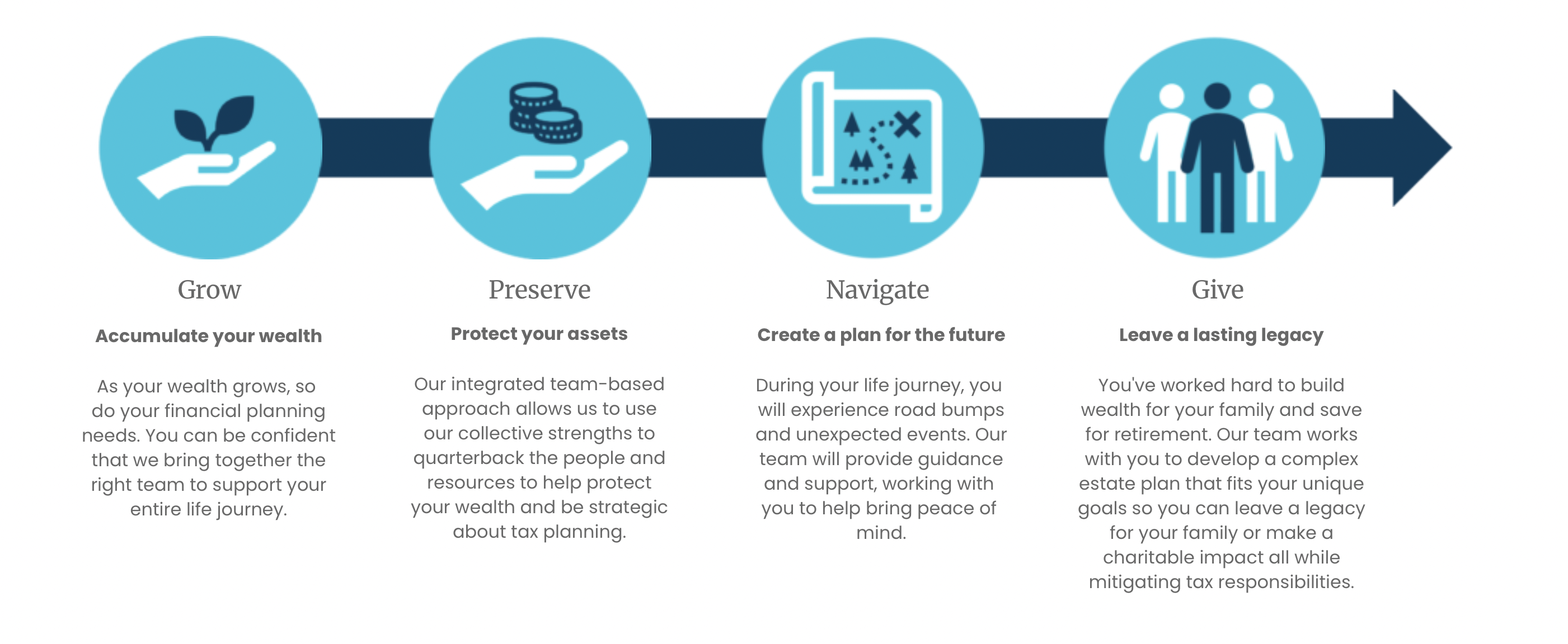 Our holistic planning process, The Way ForwardTM, leverages the academic and professional experiences of our in-house team to provide an in-depth understanding of your dreams and goals and to develop a tax conscious, customized plan to meet your unique needs and life goals.